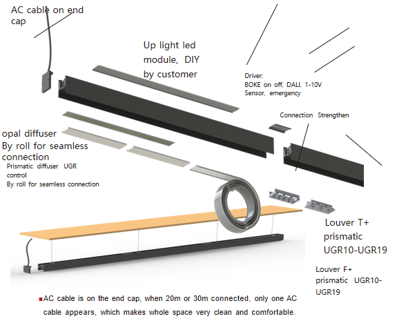 AC cable is on the end cap, when 20m or 30m connected, only one AC cable appears, which makes whole space very clean and comfortable.